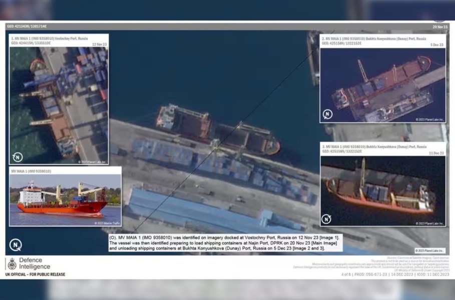 В докладе оборонной разведки Великобритании, с которым ознакомилась Guardian, показаны снимки, сделанные в период с сентября по декабрь 2023 года, на которых три российских судна — «Майя», «Ангара» и «Мария» — загружают контейнерами в северокорейском порту Раджин, затем они следуют в российские порты на Дальнем Востоке. Все суда попали под санкции правительства США в 2022 году за их связи с судоходной компанией Министерства обороны России ООО «Оборонлогистика», которая «участвовала в незаконном захвате и оккупации Крыма Россией с 2014 года, а также с частными российскими морскими судоходными компаниями, которые перевозят оружие и другое военное оборудование для [правительства России]».