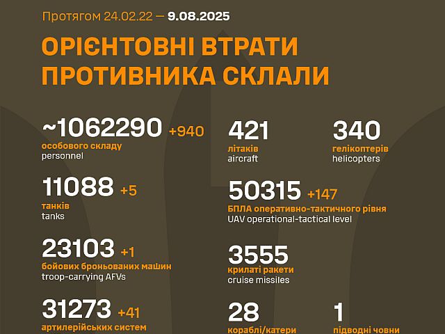 Генеральный штаб Вооруженных сил Украины 9 августа 2025 года опубликовал новые данные о потерях российской армии в ходе боевых действий на украинской территории (с 24 февраля 2022 года). Идет 1263-й день войны, учтены данные за предыдущий день.