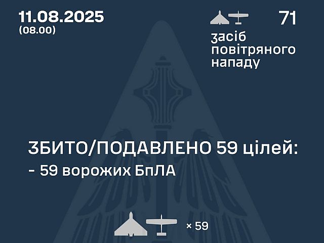 Генштаб ВСУ сообщает, что в ночь на 11 августа 2025 года российские военные выпустили по Украине 71 БПЛА-камикадзе «Shahed-136/131» («Герань-2/1») и беспилотников других типов.