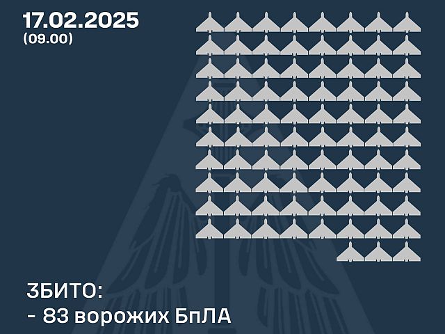 Генштаб ВСУ сообщает, что в ночь на 17 февраля 2025 года российские военные выпустили по Украине 147 БПЛА-камикадзе «Shahed-136/131» («Герань-2/1») и беспилотников-имитаторов других типов. Украинские ПВО перехватили 83 беспилотника, запущенных российскими военными. Еще 59 «шахедов» были локационно потеряны в регионах Украины.
