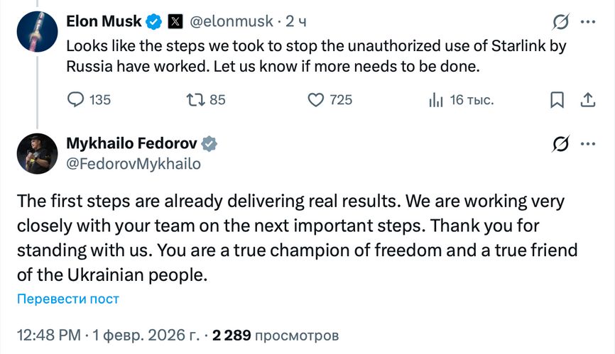 «Похоже, предпринятые нами шаги по пресечению несанкционированного использования Starlink Россией принесли свои плоды. Сообщите нам, если потребуется принять дополнительные меры», — написал Маск 1 февраля, отвечая на твиты Фёдорова с описанием проблемы, опубликованные 29 января. В ответ министр обороны написал: «Первые шаги уже приносят реальные результаты. Мы тесно сотрудничаем с вашей командой, работая над следующими важными шагами. Спасибо за поддержку. Вы — настоящий борец за свободу и верный друг украинского народа».