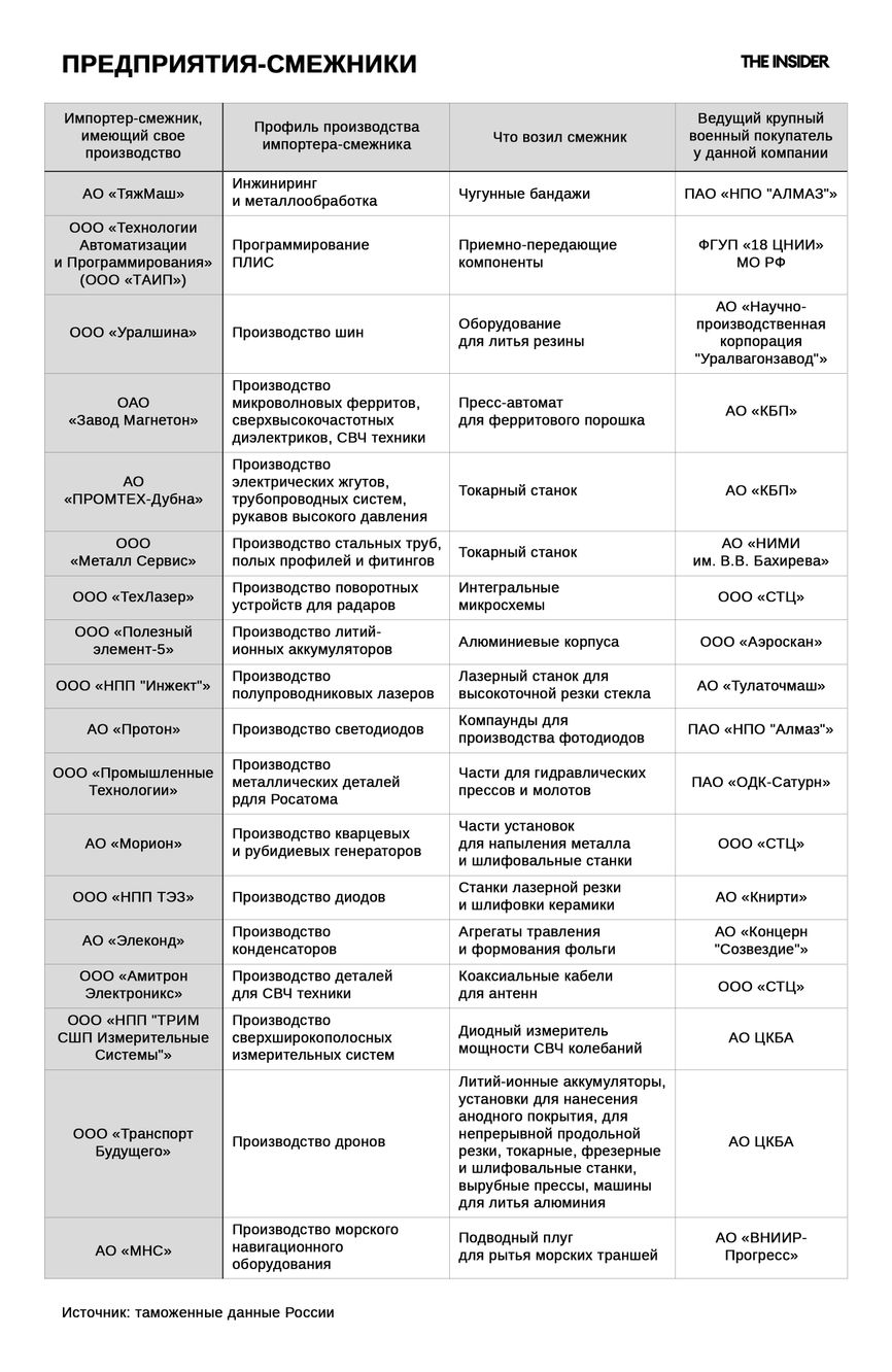 Целый ряд компаний ввозят фрезерные и токарные станки, часть которых поставляется ВПК. Среди них — «Мир Станочника», «Ай Машин Технолоджи», «АМГ», «Промсервис», Балтийская промышленная компания. О сотрудничестве некоторых из них с ВПК The Insider уже писал.