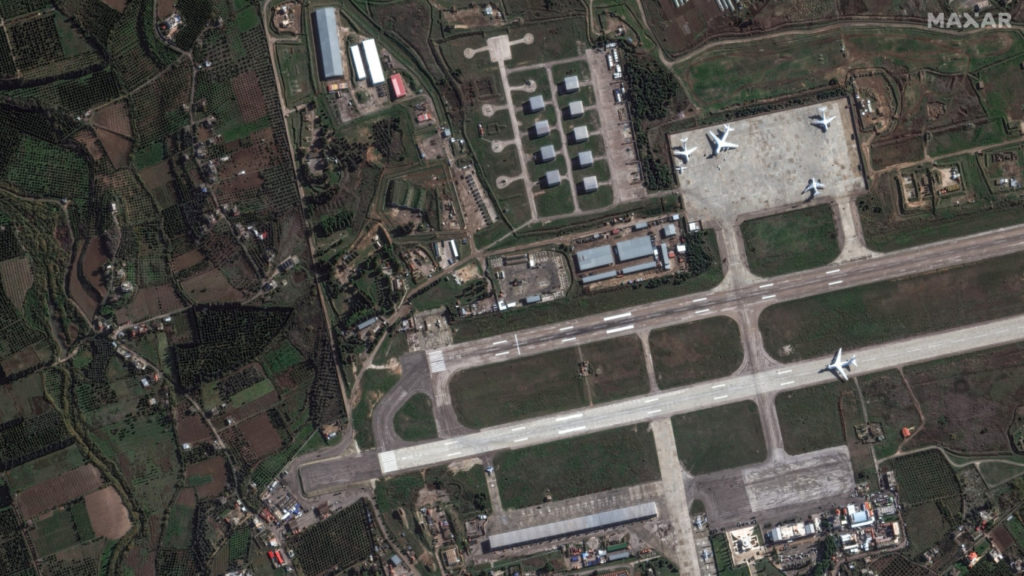 Maxar imagery shows two An-124 heavy transport aircraft at Russia’s Khmeimim airfield with their nose cones opened to load heavy equipment as well as helicopters being dismantled and readied for transport.