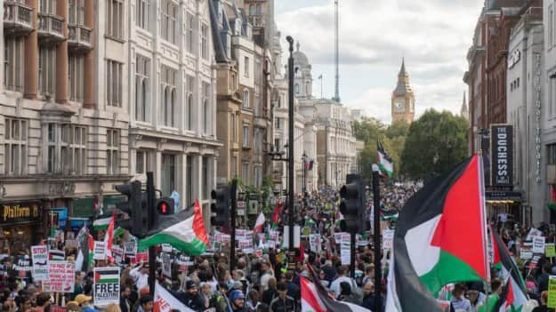 В субботу, 5 октября, пропалестинские демонстранты прошли маршем через центр Лондона, в результате чего полиция города арестовала 17 человек. Об этом сообщило BBC.